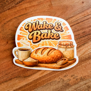 “Wake & Bake" Waterproof Vinyl Sticker – the perfect blend of fun and functionality for all sourdough enthusiasts! This charming sticker features a playful design that celebrates the joy of baking and the rise of artisanal bread-making.
